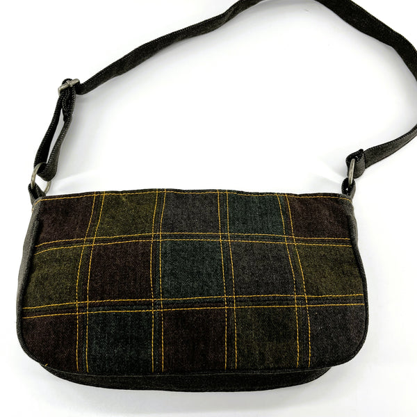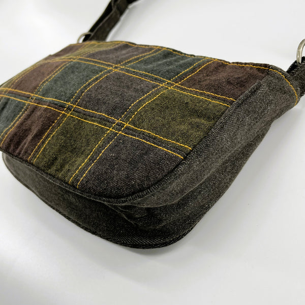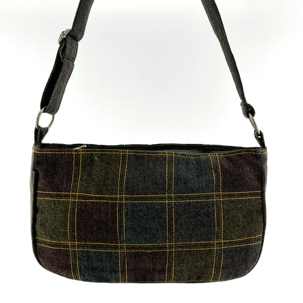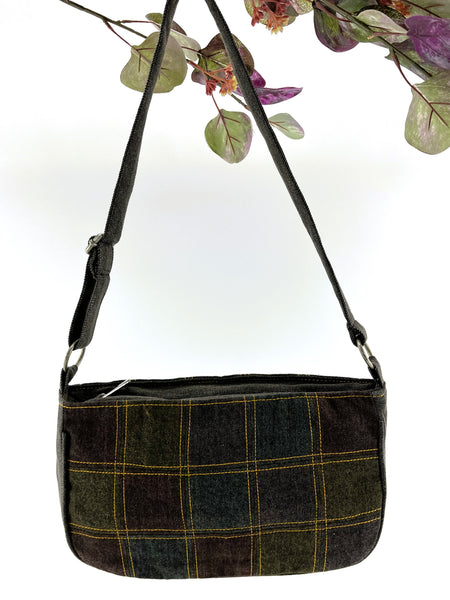 Extremely durable handcrafted upcycled color denim shoulder bag in dark multicolor tones. Wide gusset base and double lined adjustable handle. Zipper top closure, lining and cording for extra durability. Zipper pocket as well as open pocket inside.